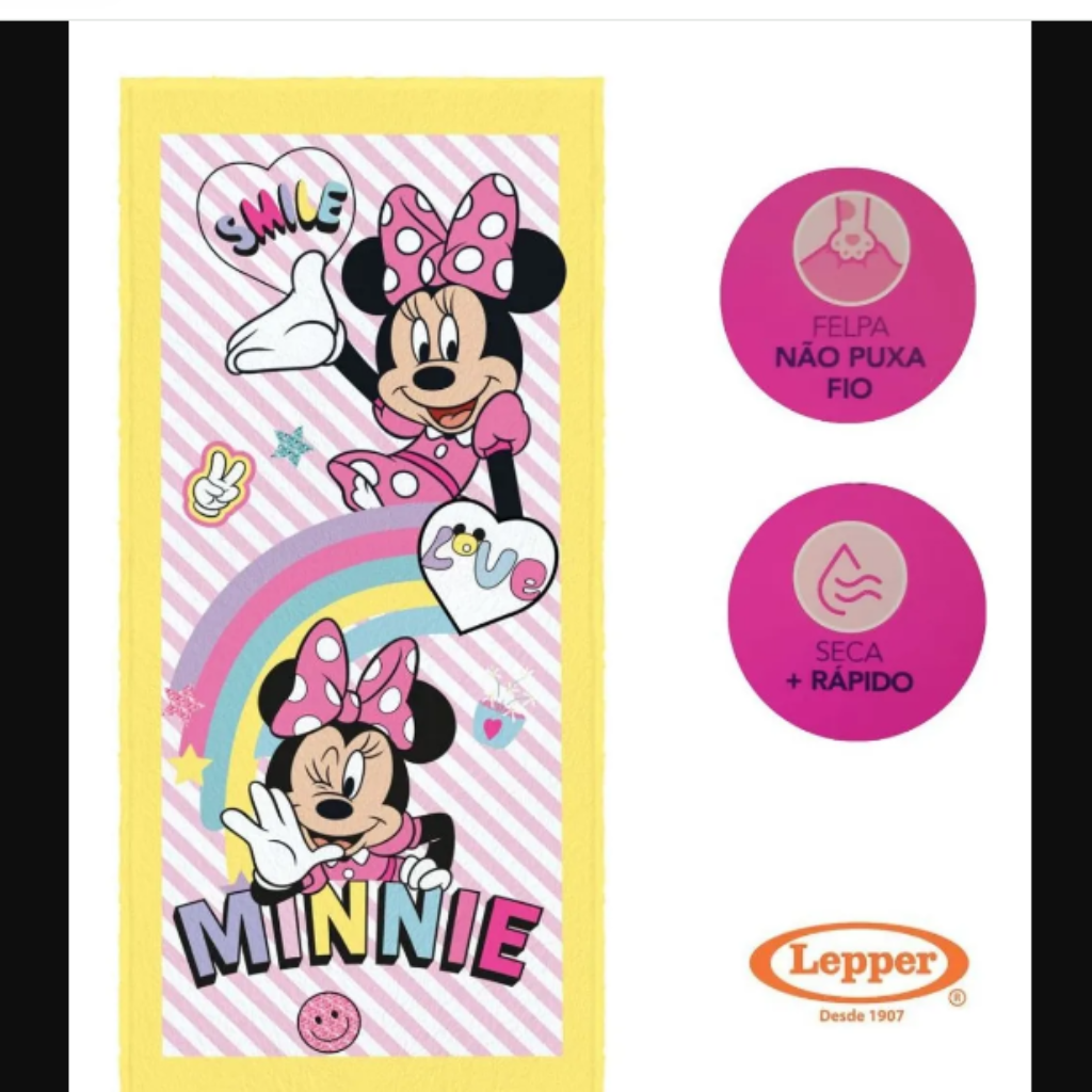 A toalha felpuda da coleção MINNIE com muita diversão e conforto garantidos, as toalhas apresentam a exclusiva qualidade da felpa que não desfia, ótima absorção e durabilidade. Essa é a magia dos produtos Lepper na rotina dos pequenos.